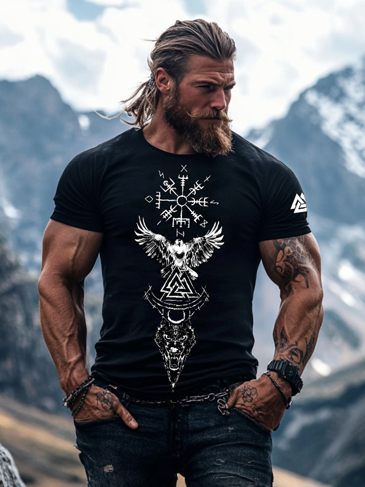 Simpfit Herren T-Shirt mit Wikinger-Stammesadler, Wolf, Runen-Grafik, kurz?rmelig
