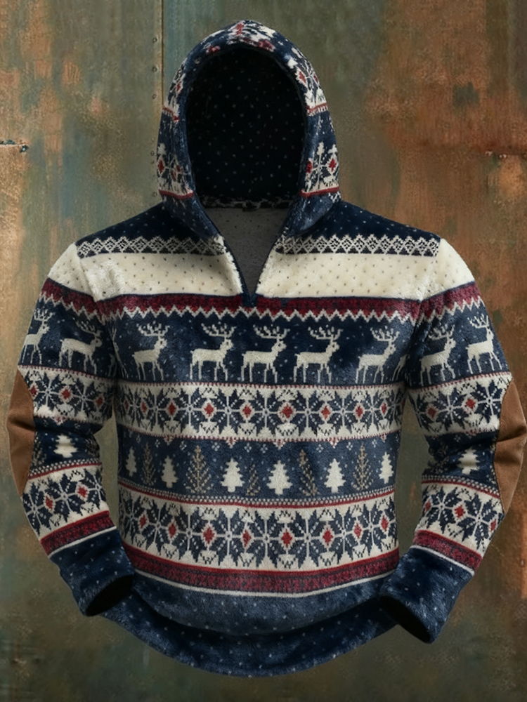 Simpfit Herren-Flanellpullover im Vintage-Stil mit Weihnachtsmotiv und Hirschmotiv, Kapuze
