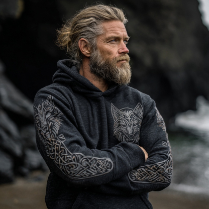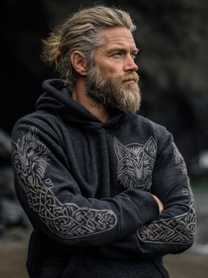 Simpfit Herren-Hoodie im Vintage-Stil mit Wikinger-Wolf-Motiv und keltischem Knoten