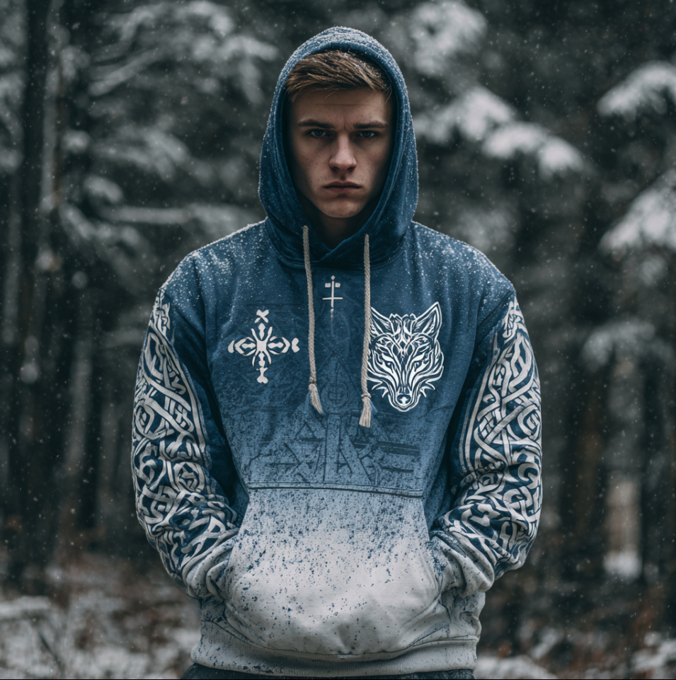 Simpfit Herren-Kapuzenpullover im Retro-Wikinger-Stil mit Schneewolfmotiv