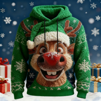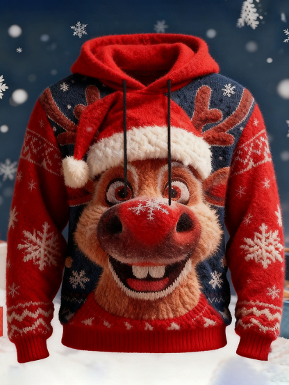 Simpfit Herren-Weihnachtspullover mit Elchmotiv im Vintage-Stil, kuschelig-flauschig, mit Kapuze