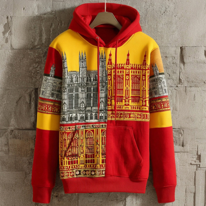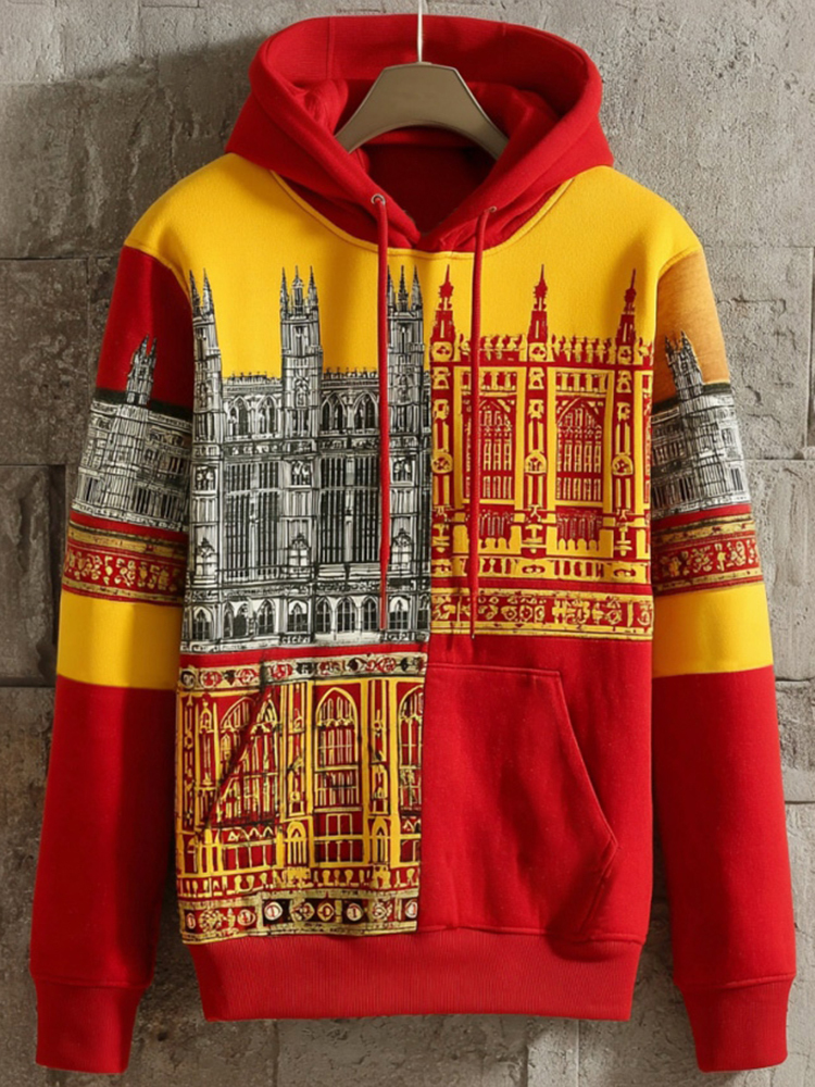 Simpfit Retro-Kapuzenpullover f��r Herren im Karnevalsstil mit gotischer Architektur und Farbblock-Design