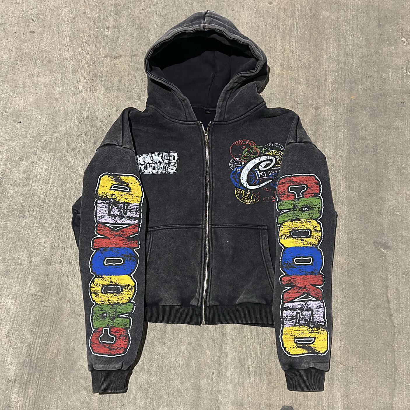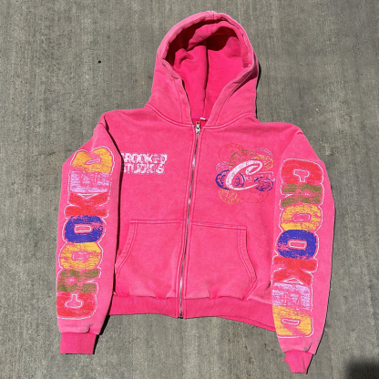 Vintage distressed print zip-up hoodie